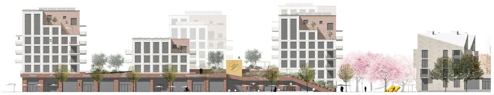 Keskuskorttelin ympärillä tiiviit asuinkorttelit muodostavat kaupunkimaista tilaa, johon on varattu tilaa kaupunkivihreälle. Väritys, materiaalivalinnat ja kattomuodot luovat vahvaa identiteettiä, joka mukautuu uutena arkkitehtonisena kerroksena vieressä olevaan vanhaan työväenalueeseen. Kortteleiden lomasta aukeaa uusia kulkuyhteyksiä tekojärven virkistysalueelle.