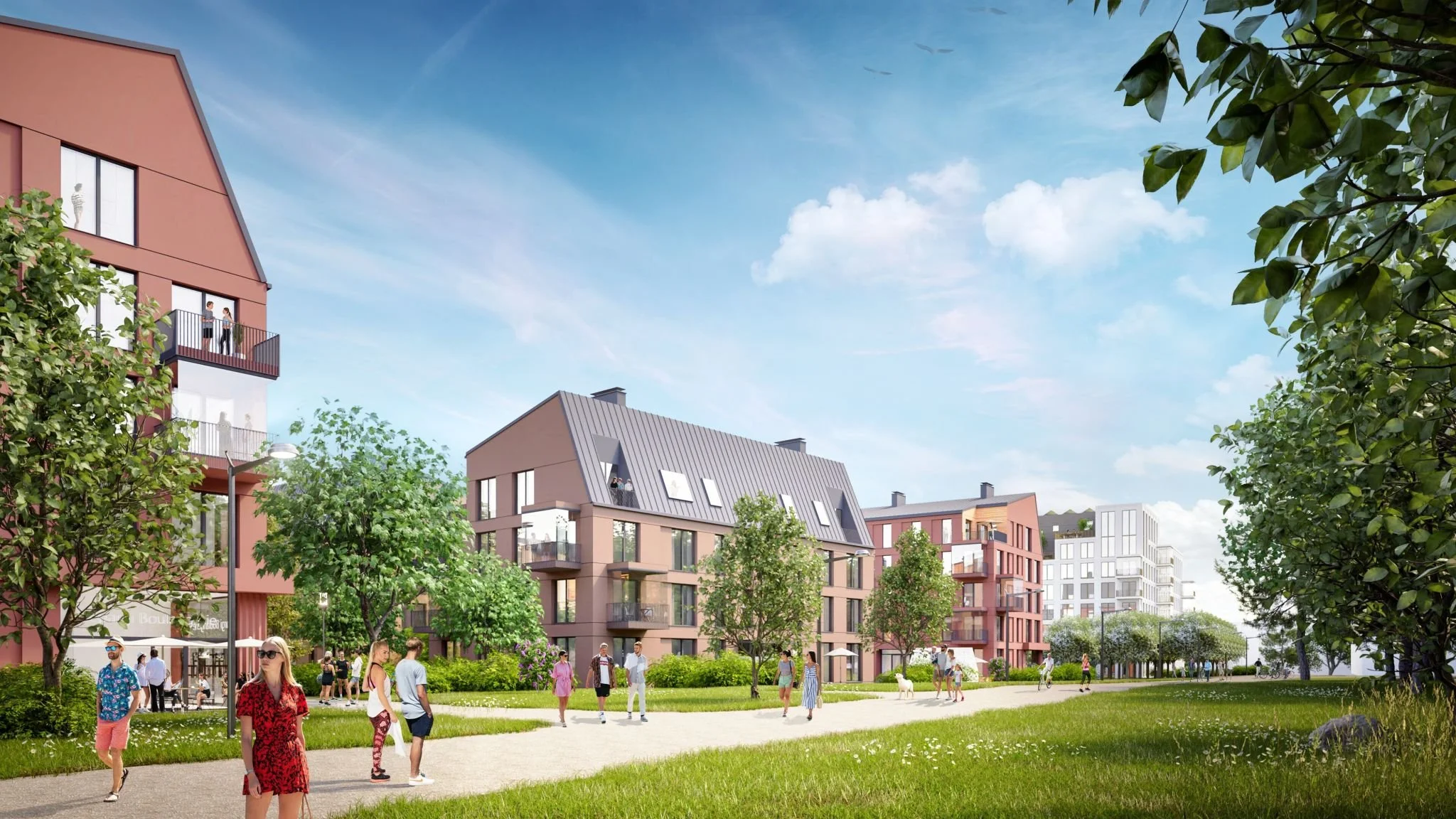 Virkistysalueen reunalla uusi rakentaminen muodostaa tunnistettavan arkkitehtonisen kokonaisuuden ja asunnoista sekä pihoilta aukeaa kauniita näkymiä viheralueelle.